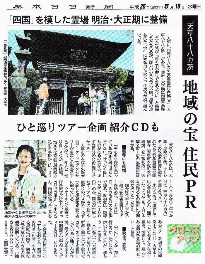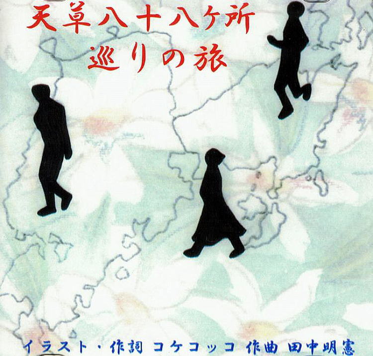 | 「天草八十ハケ所巡り旅」 「天草八十ハケ所巡り唄」 作詞 コケコッコ 作曲・歌 田中明憲 1.コスモス ゆれる 里山は 美しい この道で 良かったのか ふと 立ち止まる 右に 行こうか 左に 行こうか 迷いながら 歩いてきたけれど 進もう この道を 天草八十八ヶ所 ひとりで 巡る旅 ひとりで 巡る旅 2.夕だち あえば 草原は 厳しい この道で 良かったのか ふと 立ち止まる 坂を 登ろうか 横に それようか 濡れながら 走ってきたけれど 祈ろう 御仏に 天草八十八ヶ所 ひとりで 巡る旅 ひとりで 巡る旅 ひとりで 巡る旅 ひとりで 巡る旅 ♪♪ 天草八十ハケ所巡り旅 ♪♪ ♪♪ 天草八十ハケ所巡り唄 ♪♪