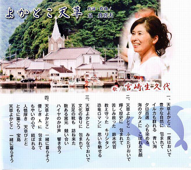 | よかとこ天草 作詞・作曲:泉 眞喜夫 編曲・楽曲演奏:中山正直 歌:宮崎生久代 1.天草よかとこ 一度はおいで 豊かな自然に 包まれて イルカも群れる 青い海 夕日百選 心も染める 海のグルメに こぼれる笑顔 2.天草よかとこ ふたたびおいで 輝く歴史に 包まれて 苦しみ救った 鈴木代官 教え守った キリシタン 恐竜ロマンに 思いを馳せる 3.天草よかとこ みんなでおいで 文化の香りに 包まれて 五足の靴も 訪ね来た 数ある窯元 競い合い ハイヤのかけ声 響きあう 4.天草よかとこ 一緒に暮らそう 優しき人に 包まれて もやいの心で 結ばれる 人情厚き 天草びとと ともに築こう 宝島 天草よかとこ 一緒に暮らそう 天草よかとこ 一緒に暮らそう ♪♪よかとこ天草(歌唱:宮崎生久代) (よかとこ天草を歌われる宮崎生久代さんは、コーラスグループすみれコールに所属されており、作詞・作曲の泉 眞喜夫さんのお姉さんです) ![]() (1)「よかとこ天草」歌詞の解説 (2)「よかとこ天草」楽譜 「♪♪五和讃歌」のページへ |