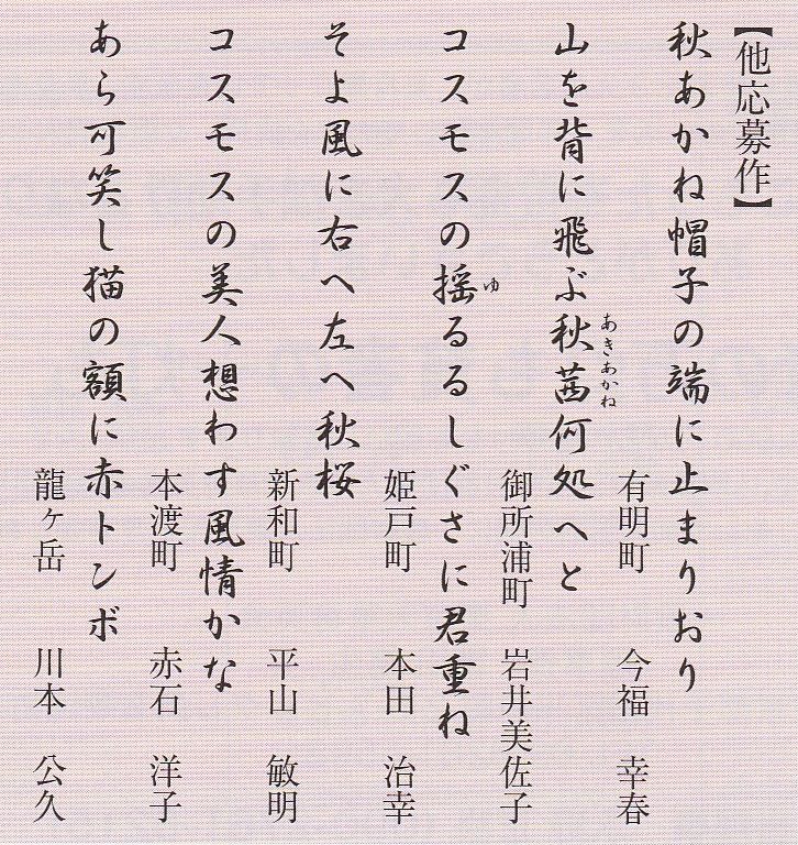 俳句と天草の仲間たち「苓洲会」発足3周年を記念して、皆様から俳句を募集しましたところ、多くの皆様よりご応募をいただきました。いただいた俳句の中より、岩崎先生に「俳句大賞(1人)」「入選(3人)」「佳作(5人)」を選んでいただきましたので、ご紹介いたします。