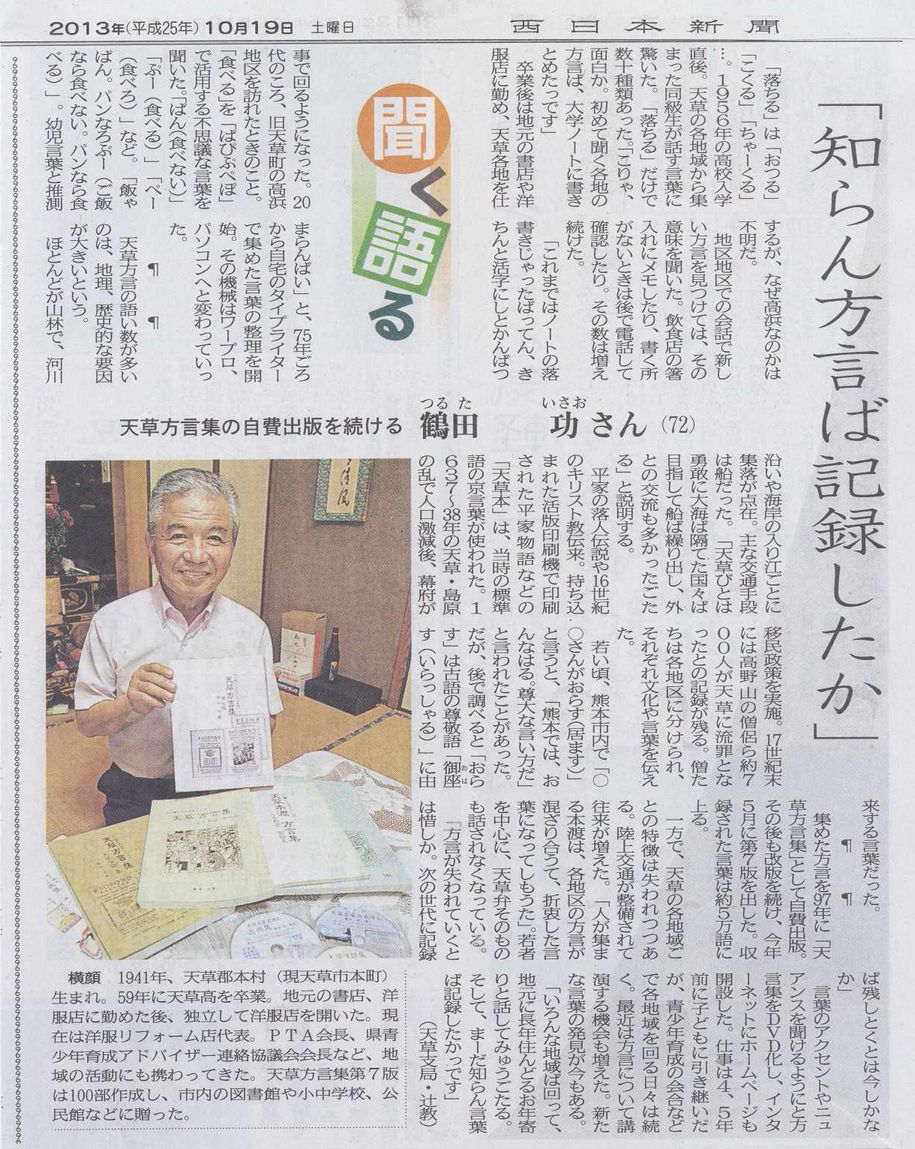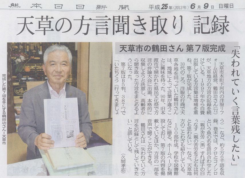 」をご紹介するコーナーです。下記の「天草方言集 第九版」のアイコンをクリックしていただくと、鶴田さんのホームページにリンクしますので、ご活用ください。